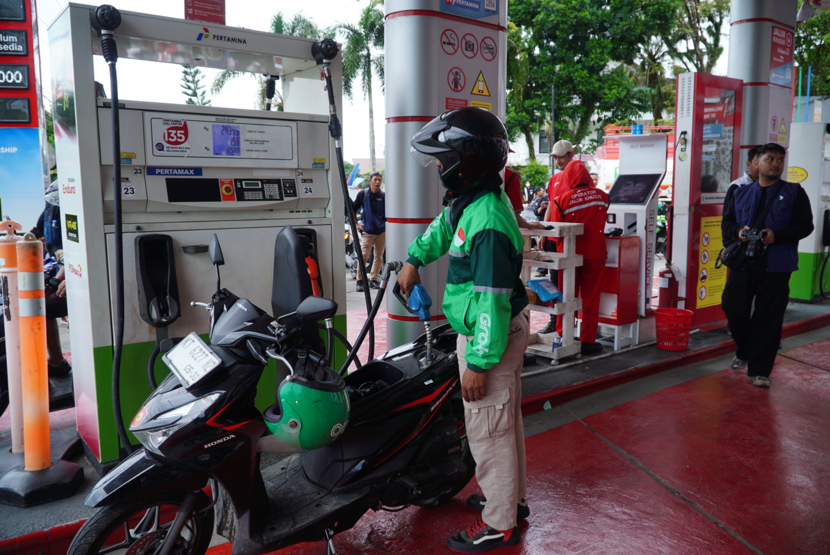 Jalur cepat isi Pertamax di SPBU Balikpapan Sepinggan, namun para pelanggan juga isi BBM sendir. Yaitu dengan self service. Tampak pengendara gojek, mengisi BBM Pertamax di jalur khusus yakni red carpet