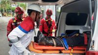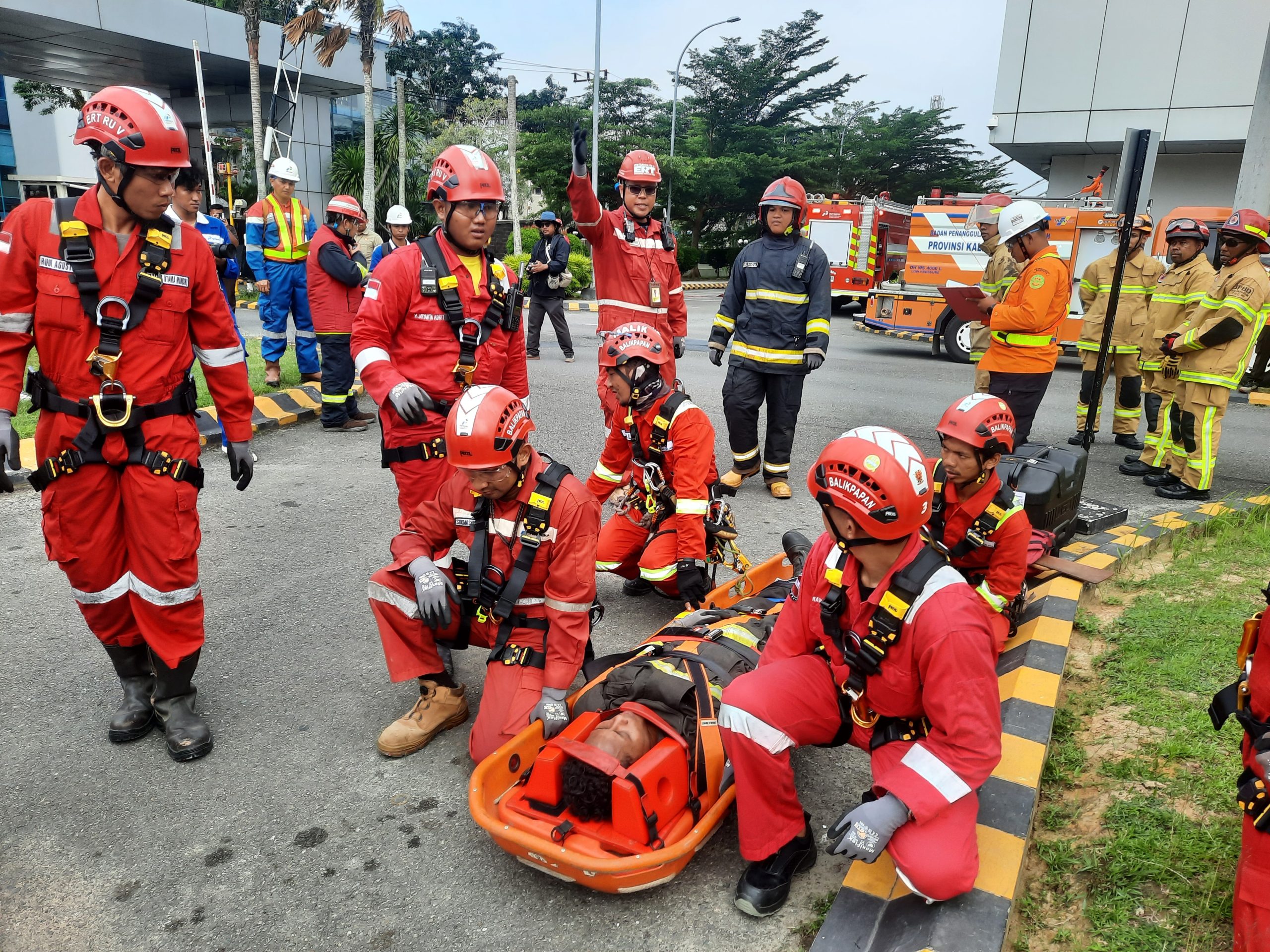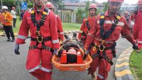 Korban simulasi dievakuasi—ada yang terbaring di tandu, ada yang berjalan terpincang.