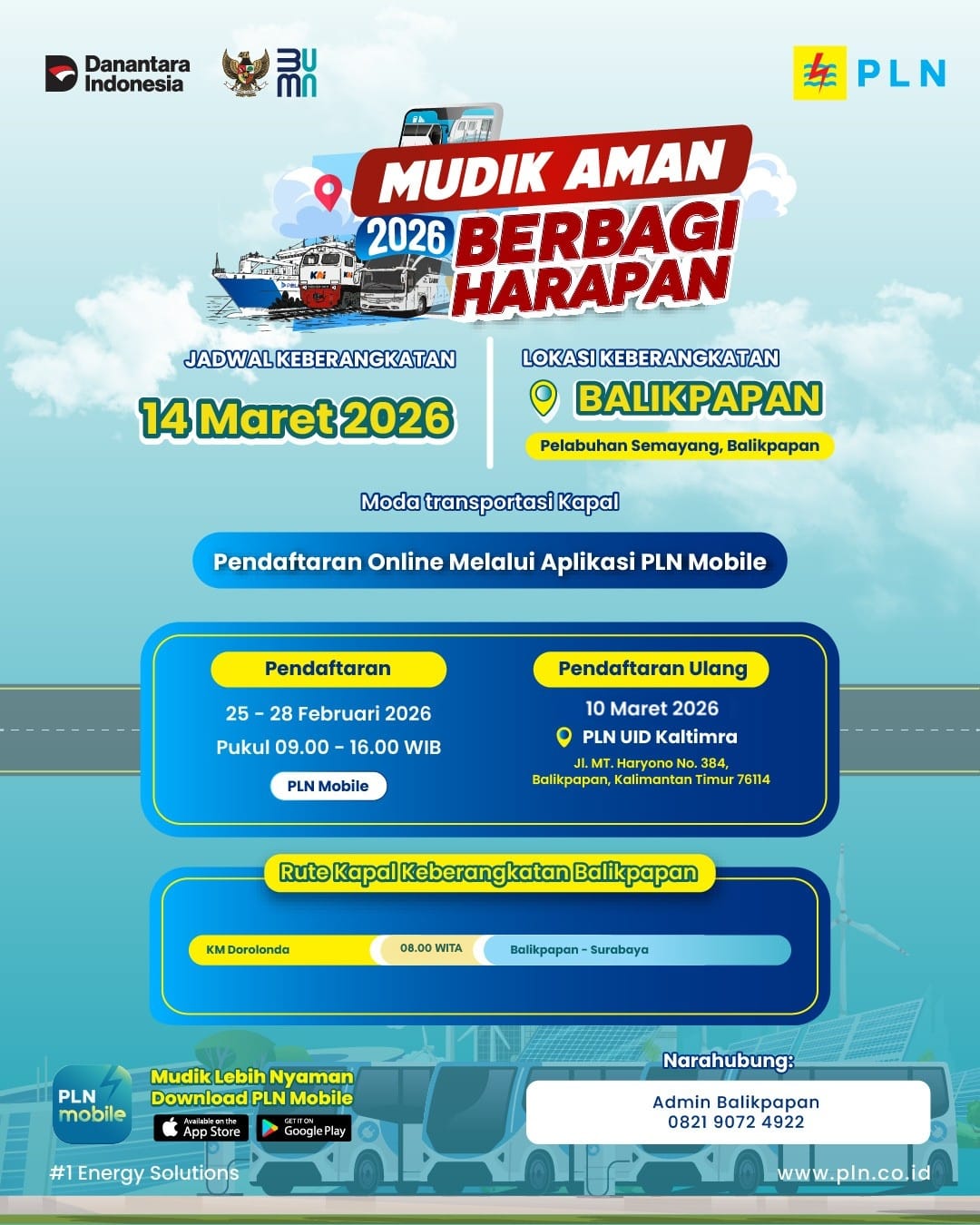 Sebagai bagian dari program nasional tersebut, PLN UID Kaltimra menyiapkan 550 kuota mudik dengan rute Balikpapan–Surabaya menggunakan moda kapal laut. Keberangkatan peserta dijadwalkan pada 14 Maret 2026 dari Pelabuhan Semayang Balikpapan menggunakan KM Dorolonda pukul 08.00 WITA.